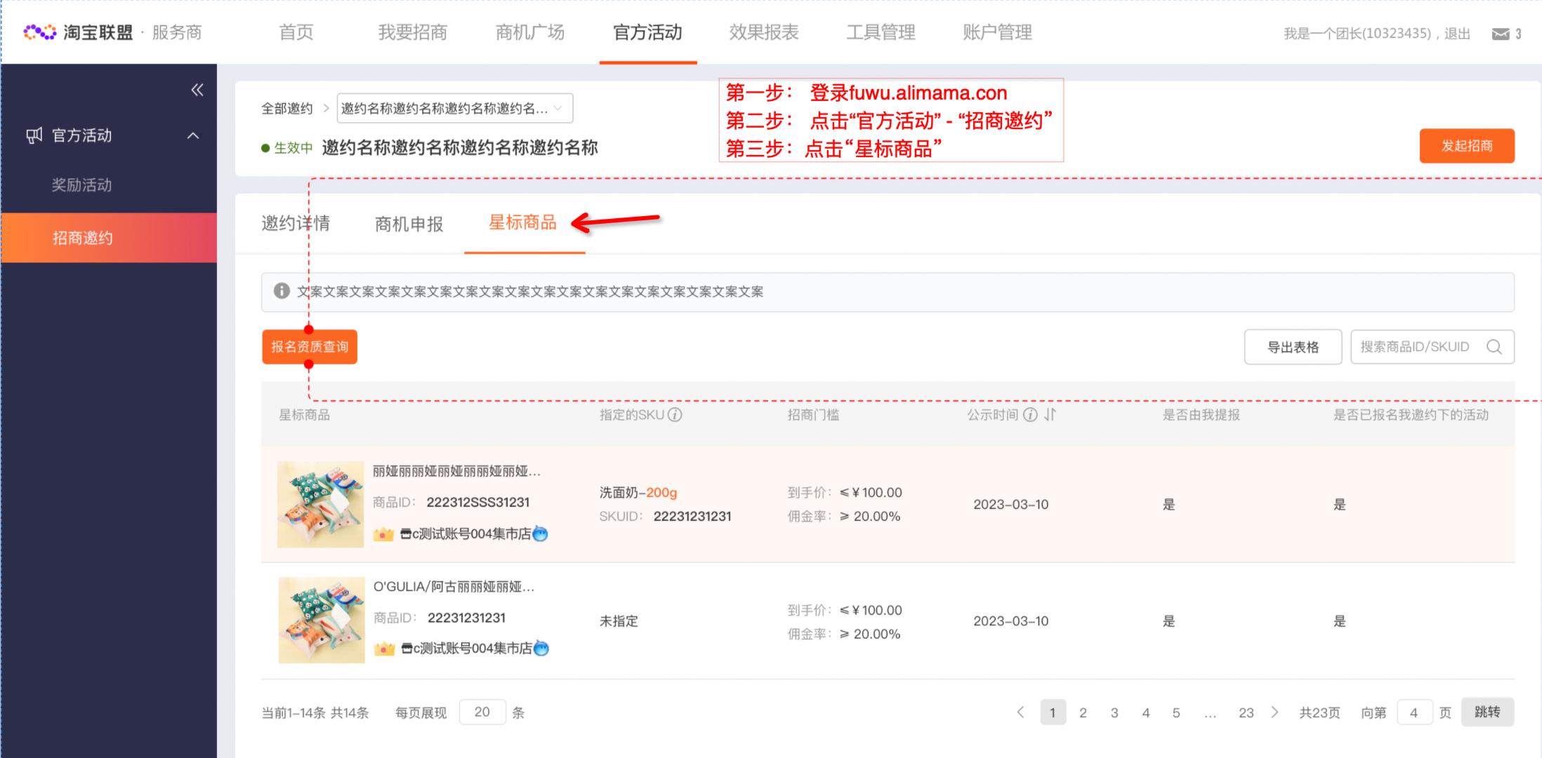 商品范围查看:活动报名通过的团长,可通过fuwu.alimama.com – 官方活动 – 招商邀约 – 星标商品,查看星标商品池及招商门槛要求。