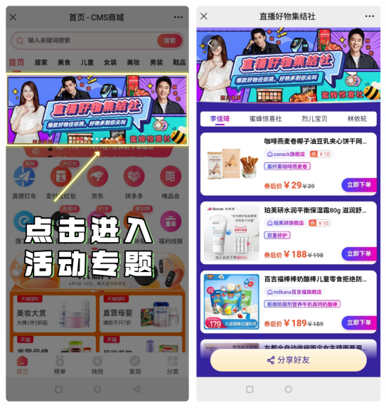 好单库CMS【直播集结社】专题汇聚李佳琦、林依轮、烈儿宝贝、蜜蜂惊喜社等人气直播间,每天更新人气爆棚好物,消费者不需再蹲守直播间也能领券低价入手,各位淘客只需一键快速推,佣金轻松赚~
